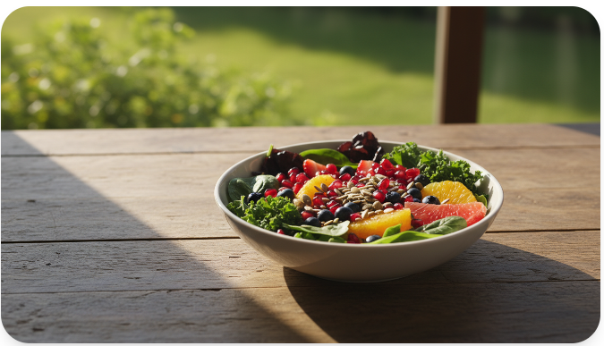 아침에 일어나자마자 밝은 햇빛을 쬐는 습관을 들여보시기 바랍니다. 햇빛은 세로토닌 분비를 촉진하여 기분을 맑게 하고, 약 15시간 후 멜라토닌으로 전환되어 숙면을 돕습니다. 식사를 할 때도 창가 쪽 밝은 곳에서 먹는 것이 소화 대사에 긍정적인 영향을 줍니다.