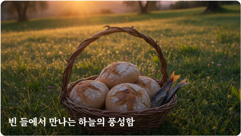 오늘 당신이 처한 상황이 비록 빈 들과 같을지라도 낙심하지 마십시오. 주님은 당신의 작은 헌신을 통해 일하기를 원하십니다. 우리의 시선을 부족한 지갑과 환경이 아닌 생명의 떡이신 예수님께 고정할 때 광야는 축제의 장으로 변합니다.