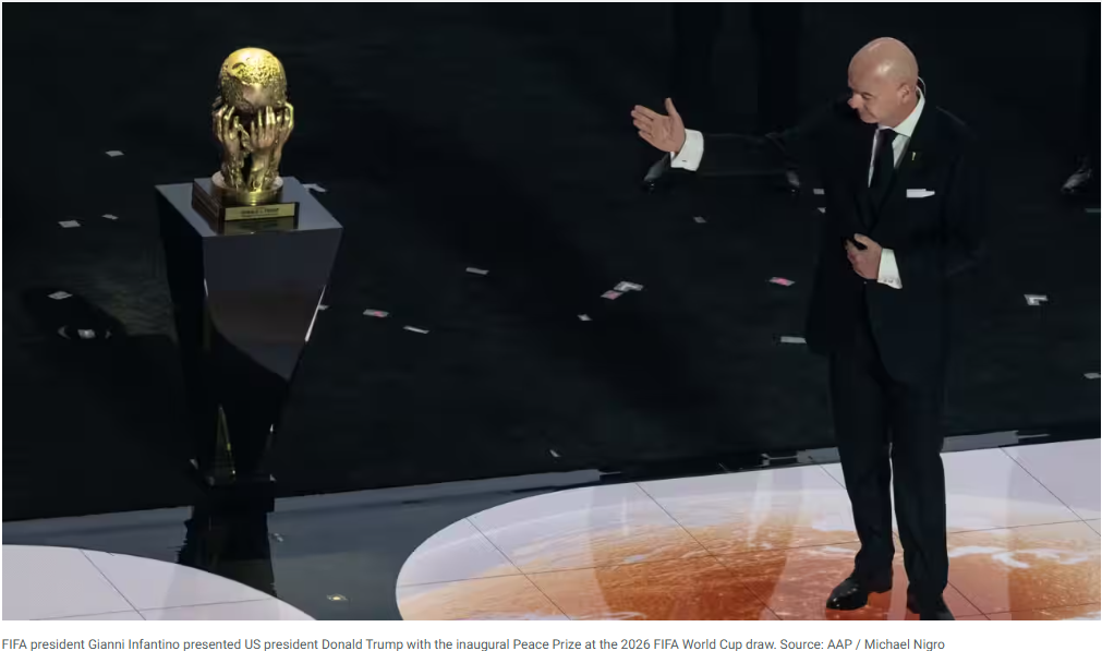 지난 2025년 12월, 워싱턴 D.C.에서 열린 2026 북중미 월드컵 조추첨식에서 잔니 인판티노 FIFA 회장은 트럼프 대통령에게 제1회 'FIFA 평화상(FIFA Peace Prize - Football Unites the World)'을 수여했습니다. 당시 인판티노 회장은 트럼프 대통령이 전 세계의 평화와 통합을 촉진한 공로를 인정하여 이 상을 제정 및 수여한다고 밝혔습니다.