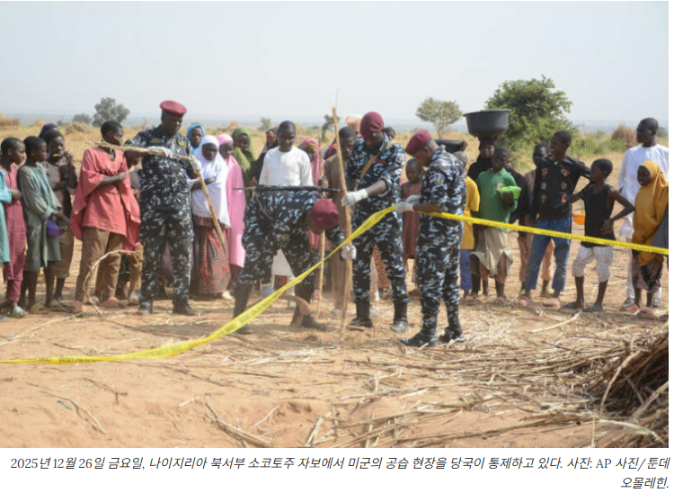 - 성탄절 공습 작전: 2025년 12월 25일, 미군은 나이지리아군과 협력하여 이슬람 극단주의 무장세력의 거점을 공습했습니다. 이는 트럼프 대통령이 나이지리아를 '종교 자유 침해 특별 우려국'으로 재지정하고 군사 행동을 경고한 지 얼마 지나지 않아 실행되었습니다.