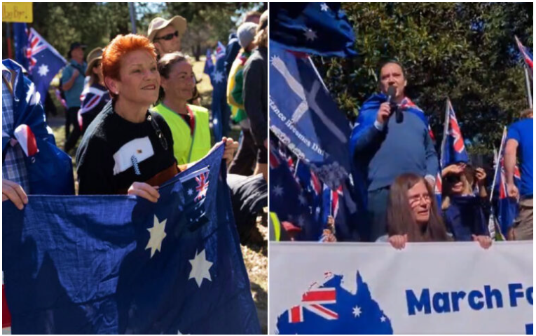 26일 낮 12시경 브리즈번 시티 보타닉 가든(City Botanic Gardens)에서 열린 '오스트레일리아 마치스'(Australia Marches) 집회에 등장한 핸슨 상원의원은 지지자들로부터 '영웅' 대접을 받았습니다. 현장에는 호주 레드 엔사인(Red Ensign) 국기를 흔드는 지지자들로 가득 찼으며, 밴드가 후두 구루스(Hoodoo Gurus)의 곡 'What's My Scene'을 연주하는 가운데 핸슨 의원이 무대에 올랐습니다.