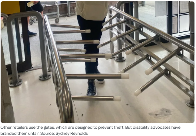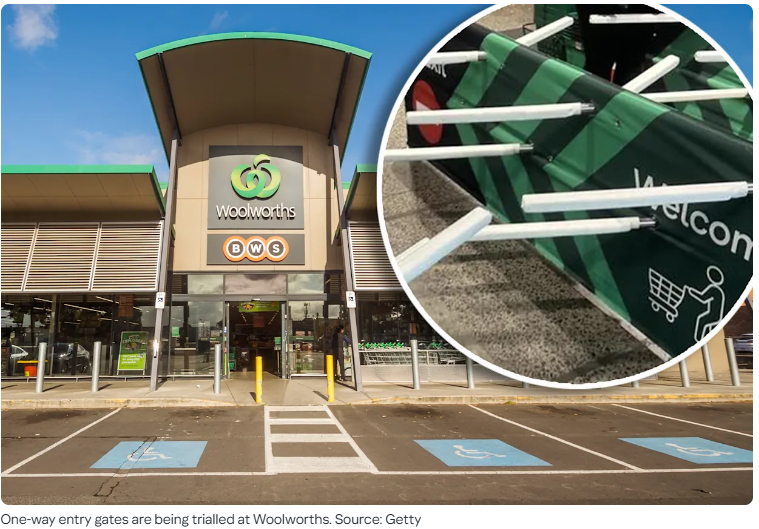 최근 울월스는 일부 매장 입구에 유연한 플라스틱 재질의 돌출형 게이트(push-through, flexible prongs)를 설치하는 시범 운영을 시작했습니다. 이 게이트는 고객이 밀고 들어간 후 뒤에서 자동으로 잠기도록 설계되어, 계산을 거치지 않은 무단 퇴장을 방지하는 역할을 합니다.