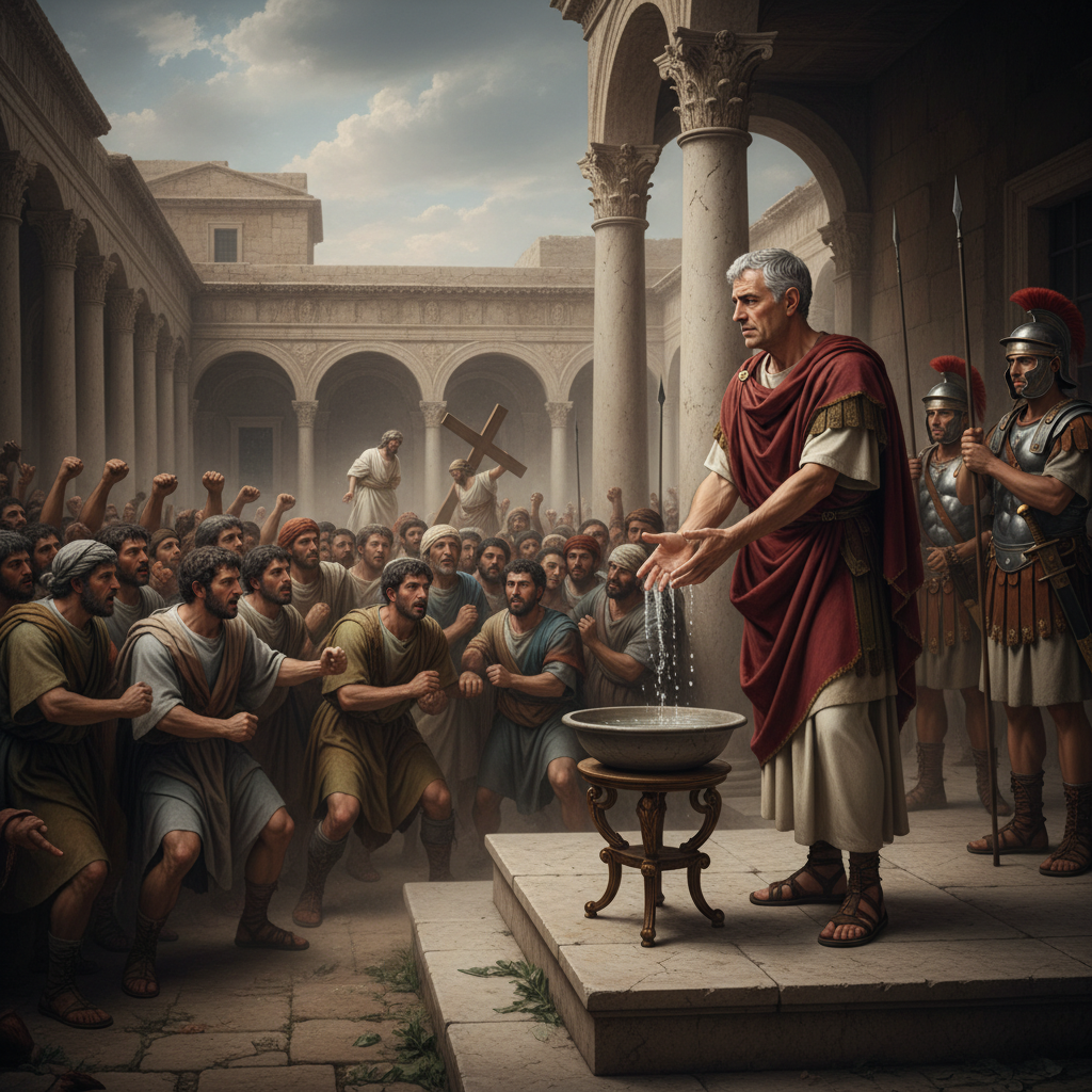 빌라도가 손을 씻었다고 할 때 쓰인 헬라어 원어는 '아포니프토(ἀπονίπτω)'입니다. 이는 단순한 위생을 위한 씻음이 아니라, '자신과 어떤 일과의 관계를 완전히 끊어내다'라는 뜻의 의식적인 행동입니다. 그는 겉으로는 무죄를 선언했지만, 진리를 알고도 방관한 그의 비겁함은 기독교 역사상 가장 씻을 수 없는 죄의 대명사로 남았습니다. 하나님의 부르심을 입은 우리는 세상의 거센 파도 앞에서도 타협하며 비겁하게 손을 씻는 자가 되어서는 안 됩니다.