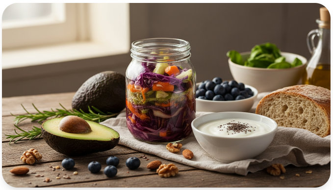 - 천연 발효식품의 생활화: 김치, 요거트(무설탕), 템페, 콤부차 등 살아있는 균이 포함된 음식을 매일 조금씩 섭취하면 장벽이 강화되어 독소(LPS)가 혈류로 흘러 들어가는 '장 누수 증후군'을 예방할 수 있습니다.
