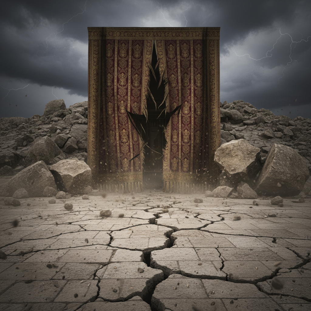 여기서 가장 중요한 포인트는 방향입니다. 만약 사람이 이 두꺼운 장막을 훼손하려 했다면 밑에서부터 위로 찢어야 했을 것입니다. 하지만 휘장은 '위에서부터 아래로' 찢어졌습니다. 이는 무엇을 의미할까요? 바로 하늘에 계신 하나님 아버지께서 직접 그 두꺼운 단절의 장막을 두 손으로 잡고 맹렬하게 찢어버리셨다는 뜻입니다.