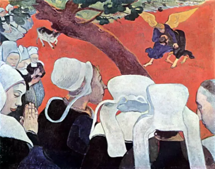 브르타뉴 지방의 사람들은 소박하고 신앙심이 깊은 전형적인 시골사람들이었다. 이들이 특정 성인의 날에 전통의상을 입고 순례제에 참석한 모습을 그린 <설교 후의 환영>을 보면, 화면 가운데 굵은 나무를 중심으로 하단에는 전통의상을 입고 기도하며 씨름을 구경하는 여인들의 모습이 있고, 오른쪽 윗부분에는 붉은 벌판에서 황금빛 날개를 단 천사와 씨름하는 야곱이 있다. 순례제에서 씨름하는 토속문화를 성서 속 인물들로 대치해 환상과 현실을 한 화면 속에 둔 것이다. 현실과 성서 속의 신화를 교묘하게 섞어놓은 이 작품에서 우리는 무엇이 현실이고 무엇이 가상인지 헷갈리는 기이한 경험을 하게 된다. 새로이 맞이하는 이 초현실적인 경험은 우리에게 눈에 보이는 현실뿐만 아니라 그 너머에 존재하는 또다른 세계를 엿볼 수 있게 한다.