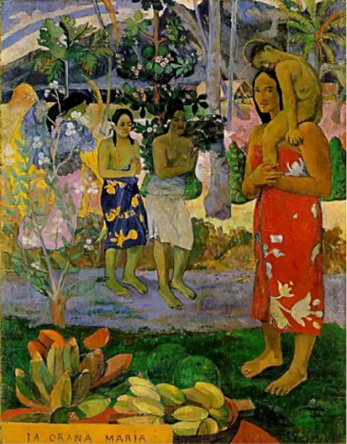 1891년 그려진 <아이오라나 마리아>는 ‘마리아에게 경배를’이란 이미를 가지고 있는데, 아름다운 남국의 섬을 배경으로 원주민 여인이 어깨에 아기를 올려안고 미소짓는 모습과 그여인을 향해 기도하는 여인들의 모습을 그린 작품이다.