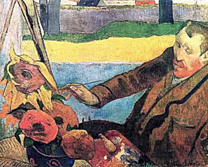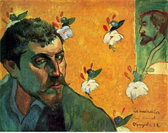 고흐의 동생 테오의 소개로 만나게 된 두사람은 함께 작업을 하기로 하였으나, 고갱은 몇번씩 날짜를 연기하여 고흐를 애타게 하였다. 아를에서 고갱이 오기를 기다리던 고흐는 서로의 자화상을 그려 교환하기를 제안했는데, 고흐에게 약간의 위축감을 느끼고 있던 고갱은 망설임 끝에 <레 미제라블> (1888년)이라는 제목의 자화상을 그려 보내게된다. 스스로의 모습을 그가 좋아했던 빅토르 위고의 소설 <레 미제라블>의 장발장에 투영해 그린 이 작품은 암울한 자신의 처지와 장발장의 고난을 동일시해 그린 것 같다. 이 그림을 받아본 고흐는 매우 기뻐하며 자신의 자화상을 보내 답하고 그를 독려했다. 고갱 역시 이에 고무되어 <해바라기를 그리는 고흐>(1888년)라는 작품으로 그가 인상깊게 보았던 고흐의 모습을 표현하였다.