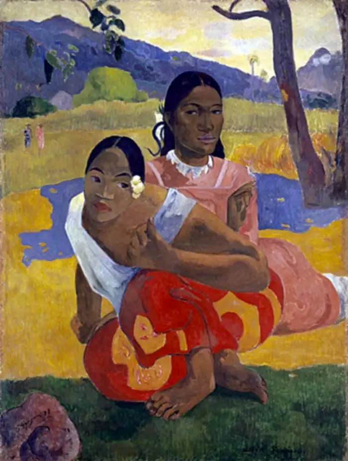 8. 1892년 제작된 <언제 결혼하니?>는 타히티섬의 뜨거운 태양아래 앉아있는 두 여인을 그린 그림이다. 그의 원시주의 회화가 만개할 무렵의 이 작품은 큼직큽직하게 나뉘어진 색면의 분할로 배경을 처리하고 있다. 산이나 풀밭, 그림자들이 푸른색, 황금색 덩어리로 표현되어 각 색깔은 스스로의 존재를 강렬하게 드러낸다. 앉아있는 여인의 형태 역시 흰색과 붉은색 의상, 갈색톤의 피부색이 먼저 색채 그자체로 우리에게 다가와 아름다운 색상들이 조화롭게 어우러진 반추상화를 보는 듯 하다.